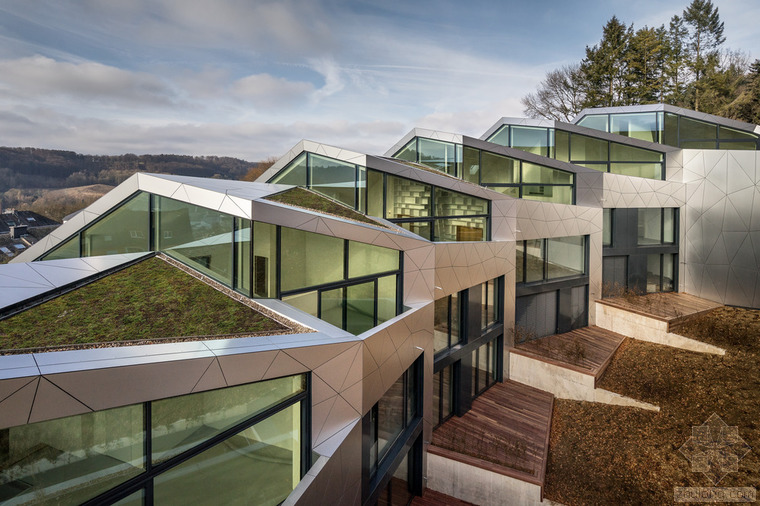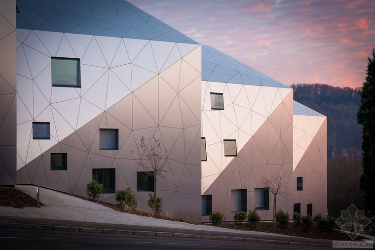 根據(jù)城市建筑規(guī)章條例規(guī)范,無(wú)論地形有多奇怪,都可以建造簡(jiǎn)易的兩層單體建筑,并且?guī)в械叵率?。但是,周圍的環(huán)境、特殊的地形條件和基地的形式造就了各種各樣的建筑,與此同時(shí)也產(chǎn)生了上文所指出的問(wèn)題?;匚挥谝粭l十分彎曲的街道邊緣;地形高差達(dá)10米,非常陡峭;基地上保留有樹(shù)齡300年的古樹(shù),且被列為國(guó)家歷史文物。所有的這些狀況使建筑有了最初的形狀。此外,該建筑還呼應(yīng)了特殊的城市環(huán)境(一邊是小體量的住宅單元,而另一邊是大體量的公寓樓。)建筑師通過(guò)將主體分成六個(gè)小的、垂直位移的體塊,創(chuàng)造了一個(gè)巧妙地轉(zhuǎn)變。建筑通過(guò)這種方法適應(yīng)了環(huán)境,既保持了所需的密度,又賦予其歸屬感、特性和人性化。體塊的分割和位移需要謹(jǐn)慎地研究自然采光的需求、朝向城市景觀的開(kāi)闊視野,并且創(chuàng)造天地之間的視覺(jué)連接,同時(shí)還要保護(hù)住戶的隱私。