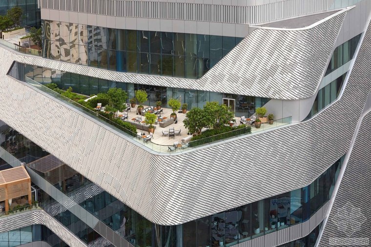 曼谷中心大使館為曼谷這座城市帶來(lái)了全新的印象,無(wú)論是從街道還是從天際線來(lái)看,它都展示出一種邀請(qǐng)的姿態(tài),歡迎曼谷人和全世界人來(lái)參觀。項(xiàng)目位于之前英國(guó)大使館的花園中,沿著曼谷最重要的商業(yè)干道 Ploenchit 大路,占地150萬(wàn)平方英尺(約139萬(wàn)平方米)的綜合體包括一個(gè)7層的奢侈品零售區(qū)和27層的五星級(jí) Hyatt 酒店塔樓。這座塔是第一個(gè)英國(guó)建筑師在泰國(guó)完成的項(xiàng)目。酒店和購(gòu)物中心使用連續(xù)循環(huán)的形式,使裙房和塔樓更直接的結(jié)合在一起。塔樓連續(xù)的線條似乎打破了裙房的大體量,在尺度上創(chuàng)造了一種非對(duì)稱的結(jié)構(gòu)。這種形式的開(kāi)放,包容了城市并且建立了一種相互的視野,一系列的室外平臺(tái)和露臺(tái)可以看到彼此。兩個(gè)垂直的光井,完全的打開(kāi)塔樓內(nèi)部空間,可以看到層層疊疊不斷向上變化的平臺(tái),同時(shí)這些平臺(tái)又劃分了酒店的功能:面對(duì) Nai Lert 公園的私人會(huì)客空間、酒吧、接待休息室和面向市中心的天臺(tái)。