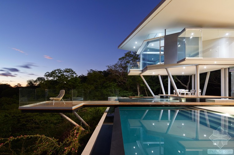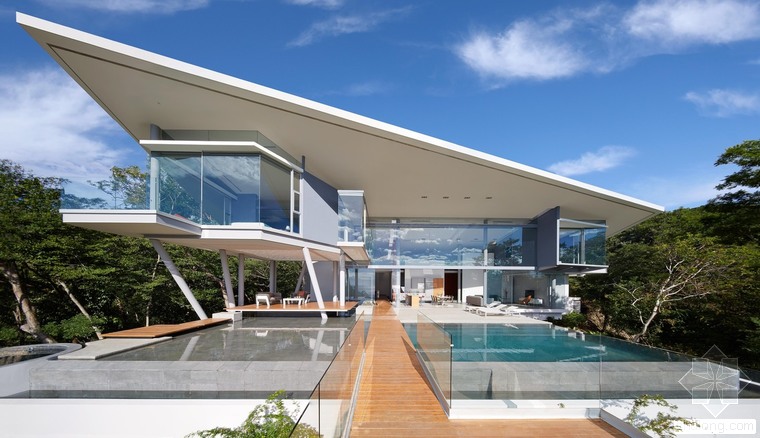 Indios Desnudos 別墅在加約半島,位處于朝海的一個(gè)尖端處,略向下傾斜的半島形山脊,兩邊有森林(其中一個(gè)是自然保護(hù)區(qū))。這個(gè)名字來(lái)自于場(chǎng)地里最有特點(diǎn)的一些樹(shù):indio desnudo(赤裸的印第安人),它們組成了別墅的一個(gè)焦點(diǎn),特別在居住區(qū)。別墅的設(shè)計(jì)旨在讓人享受室外生活和視野。因此,它被設(shè)計(jì)成在沒(méi)有空調(diào)的條件下仍然能舒適生活的建筑。室內(nèi)空間與室外空間相整合,在室內(nèi)的同時(shí)感覺(jué)像在室外。所有的居住空間都有通向大海或是森林保護(hù)區(qū)的視野。它有其主要的通向大堂的通道,你可以通過(guò)它看到社交區(qū)和大海。從這里你可以使用像木棧道一樣的走道,懸在分散的河石上,組成了流線的兩條軸線,組成樓層平面圖,或者使用樓梯通過(guò)橋梁到達(dá)兩個(gè)主臥室。