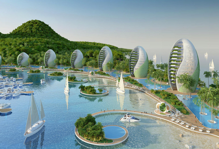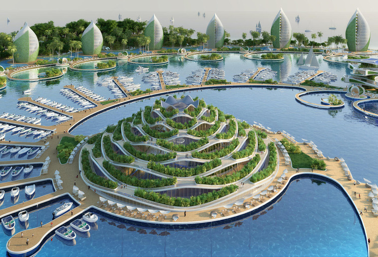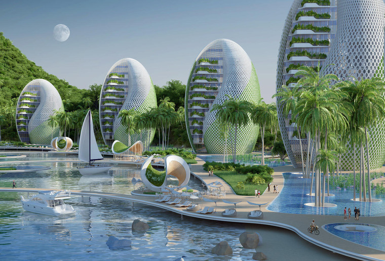 度假村廣泛使用“從源頭到源頭”的再利用方略和其他可持續(xù)設(shè)計(jì)策略,將本次方案設(shè)計(jì)成一系列螺旋形式的公寓樓和貝殼狀的旅館建筑,并將這些建筑按照兩條斐波納契螺線的旋轉(zhuǎn)軌跡排布于沿海環(huán)礁湖的岸邊。建筑群的中心是一座山形的綜合體,里面設(shè)置有學(xué)校、休閑游泳池、體育大廳、供度假村使用的廚房以及供環(huán)境科學(xué)家使用的整套實(shí)驗(yàn)室用房。本次方案起名為“鸚鵡螺生態(tài)度假村”,生態(tài)設(shè)計(jì)是本次項(xiàng)目的主要側(cè)重點(diǎn),Vincent Callebaut事務(wù)所精準(zhǔn)地指出對(duì)菲律賓群島構(gòu)成的環(huán)境威脅并以此作為設(shè)計(jì)靈感。方案中運(yùn)用了各種各樣的可再生能源,包括潮汐能與太陽(yáng)能,如果這些自產(chǎn)的能源在使用后還有結(jié)余,便會(huì)連接到地方電網(wǎng)并提供給社區(qū)。